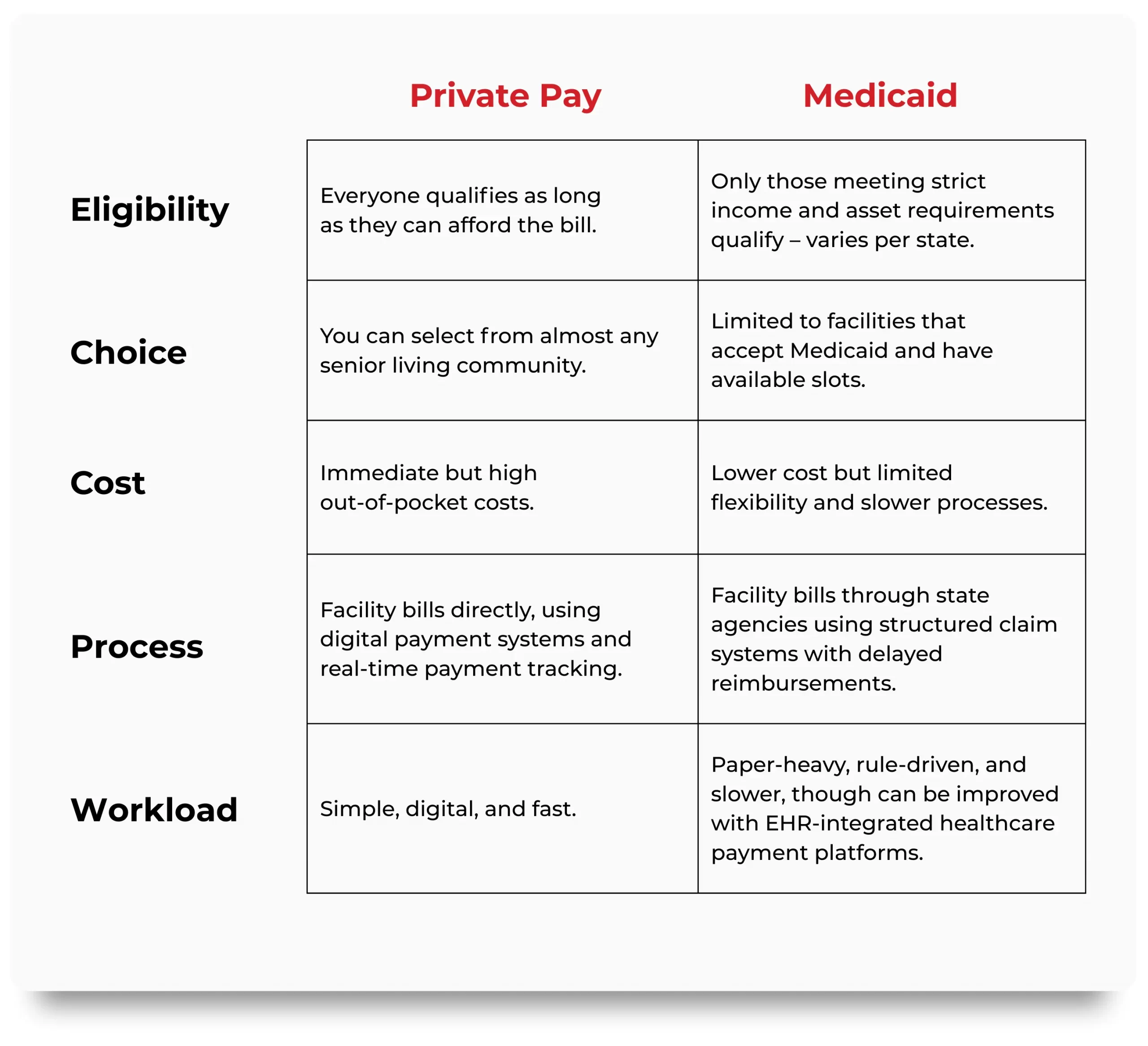 In senior living, two payment paths dominate: Private Pay (you or your family pay directly) and Medicaid (government-funded care for those with limited income and assets).