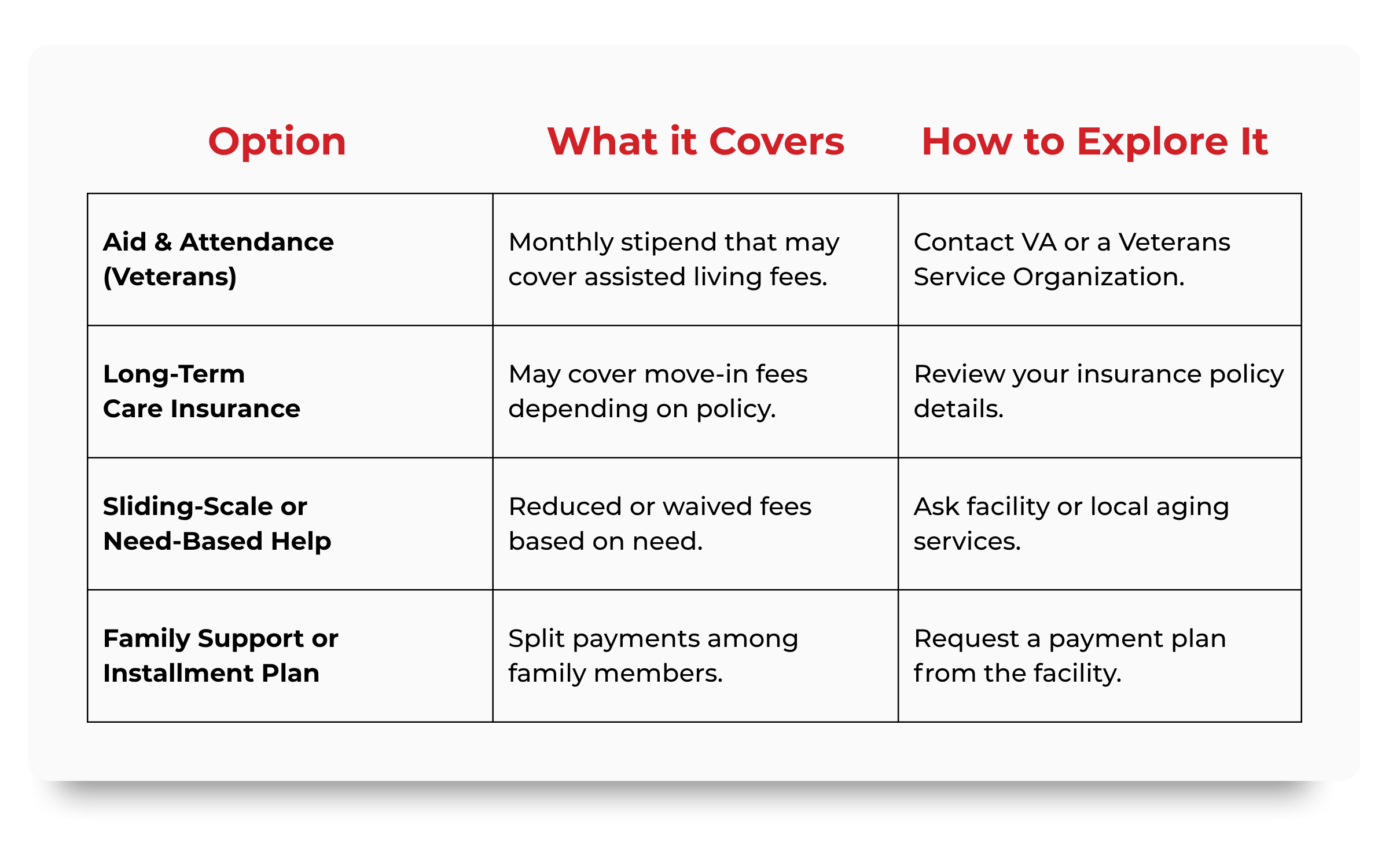If you have a long-term care insurance policy, it could cover move-in fees or assisted living costs depending on the policy. This benefit isn’t universal and varies by provider and plan, but it is always worth reviewing what your specific policy includes.